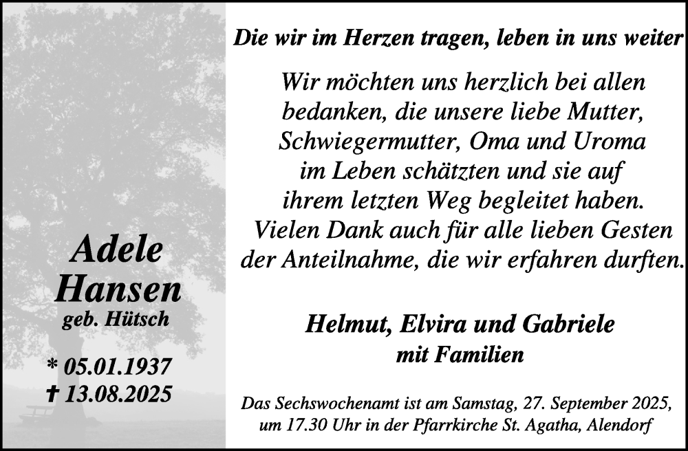 Hier finden Sie alle Traueranzeigen aus der Zeitung, die bisher für Adele Hansen erschienen sind. Weitere Traueranzeigen, die in der Zeitung erscheinen, werden hier ebenfalls aufgelistet