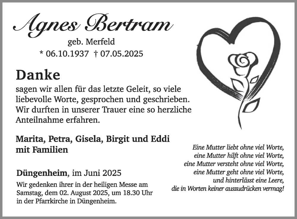 Hier finden Sie alle Traueranzeigen aus der Zeitung, die bisher für Agnes Bertram erschienen sind. Weitere Traueranzeigen, die in der Zeitung erscheinen, werden hier ebenfalls aufgelistet