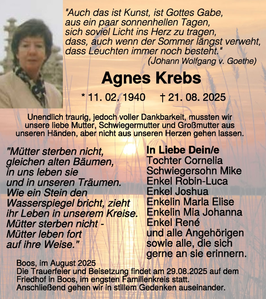 Hier finden Sie alle Traueranzeigen aus der Zeitung, die bisher für Agnes Krebs erschienen sind. Weitere Traueranzeigen, die in der Zeitung erscheinen, werden hier ebenfalls aufgelistet