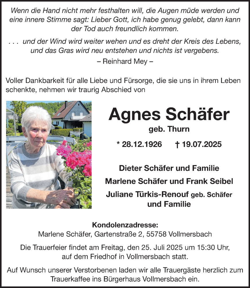 Hier finden Sie alle Traueranzeigen aus der Zeitung, die bisher für Agnes Schäfer erschienen sind. Weitere Traueranzeigen, die in der Zeitung erscheinen, werden hier ebenfalls aufgelistet