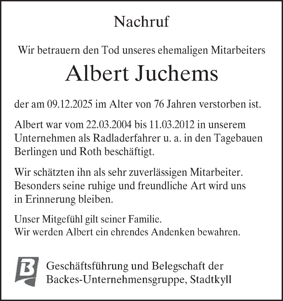 Hier finden Sie alle Traueranzeigen aus der Zeitung, die bisher für Albert Juchems erschienen sind. Weitere Traueranzeigen, die in der Zeitung erscheinen, werden hier ebenfalls aufgelistet