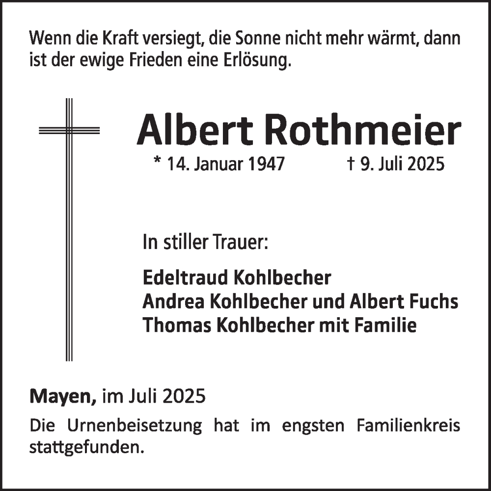 Hier finden Sie alle Traueranzeigen aus der Zeitung, die bisher für Albert Rothmeier erschienen sind. Weitere Traueranzeigen, die in der Zeitung erscheinen, werden hier ebenfalls aufgelistet