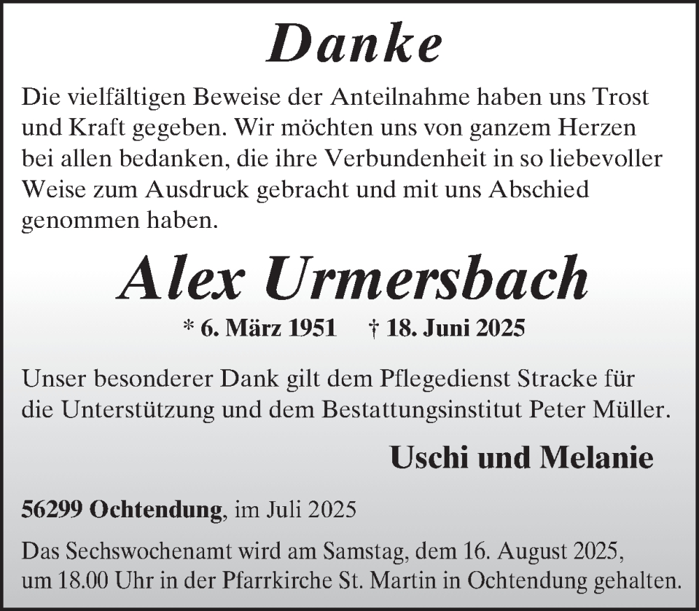 Hier finden Sie alle Traueranzeigen aus der Zeitung, die bisher für Alex Urmersbach erschienen sind. Weitere Traueranzeigen, die in der Zeitung erscheinen, werden hier ebenfalls aufgelistet