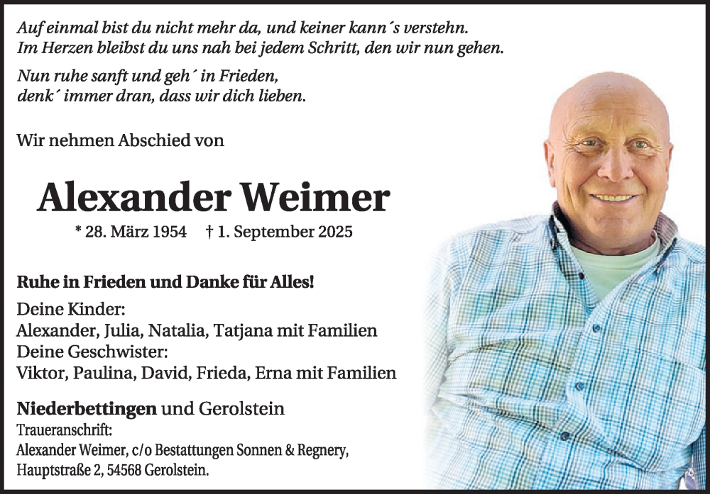 Hier finden Sie alle Traueranzeigen aus der Zeitung, die bisher für Alexander Weimer erschienen sind. Weitere Traueranzeigen, die in der Zeitung erscheinen, werden hier ebenfalls aufgelistet