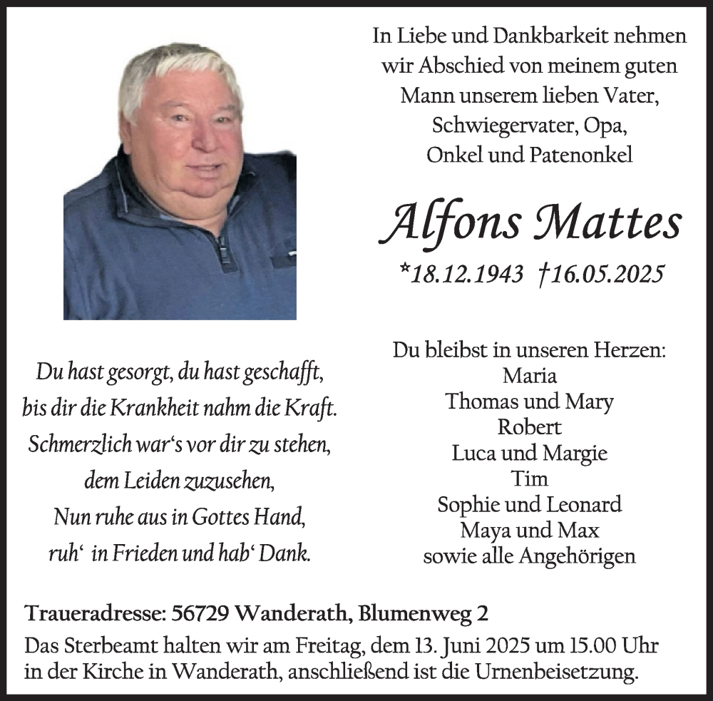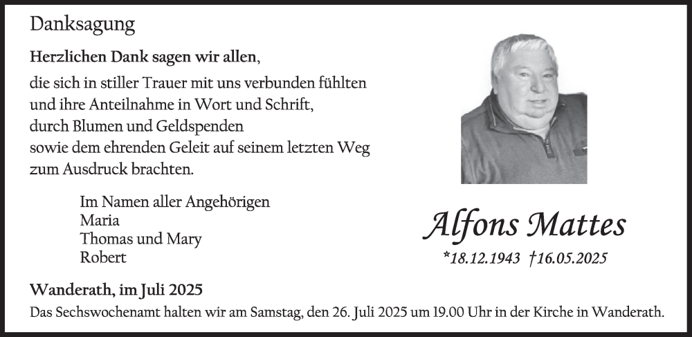 Hier finden Sie alle Traueranzeigen aus der Zeitung, die bisher für Alfons Mattes erschienen sind. Weitere Traueranzeigen, die in der Zeitung erscheinen, werden hier ebenfalls aufgelistet