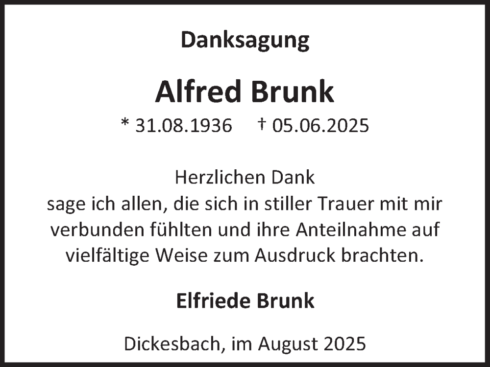 Hier finden Sie alle Traueranzeigen aus der Zeitung, die bisher für Alfred Brunk erschienen sind. Weitere Traueranzeigen, die in der Zeitung erscheinen, werden hier ebenfalls aufgelistet
