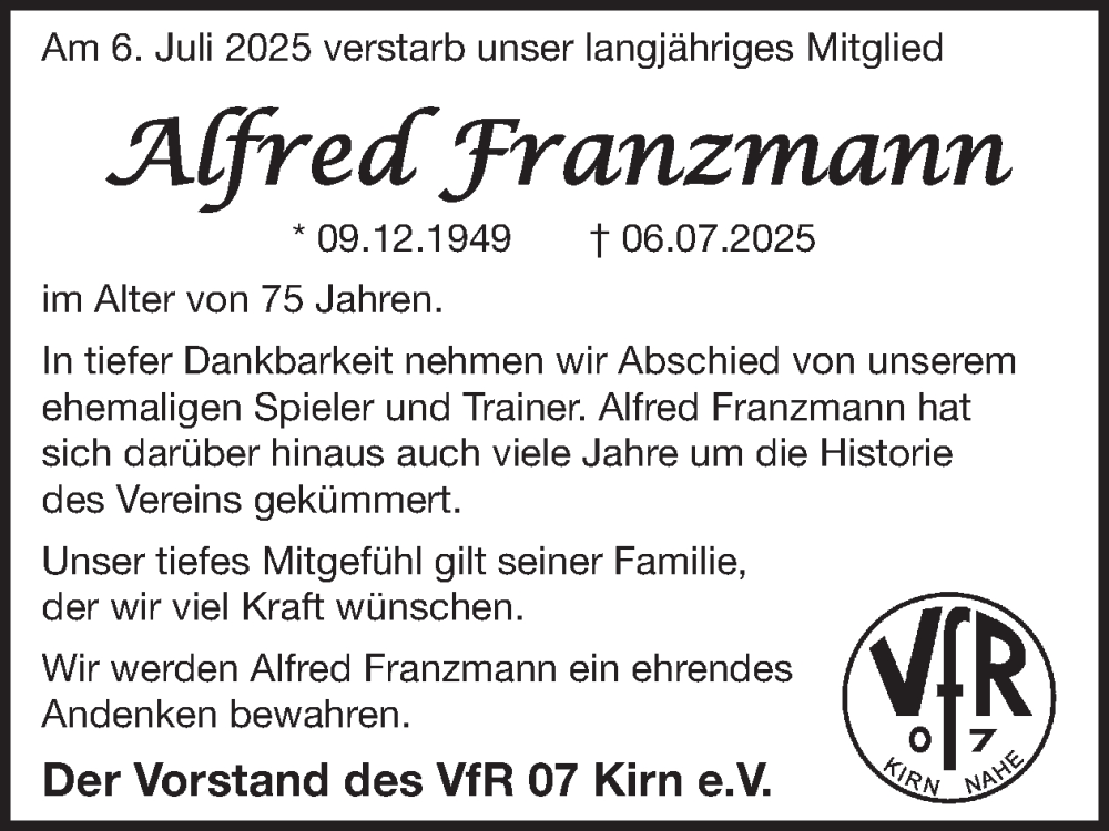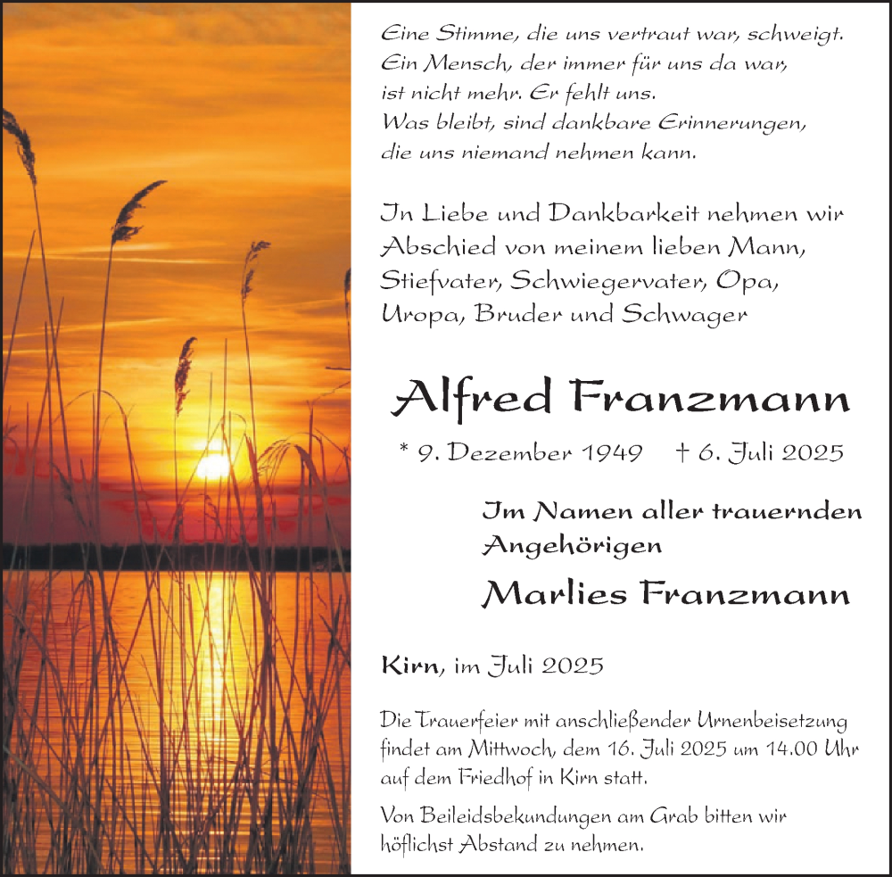 Hier finden Sie alle Traueranzeigen aus der Zeitung, die bisher für Alfred Franzmann erschienen sind. Weitere Traueranzeigen, die in der Zeitung erscheinen, werden hier ebenfalls aufgelistet