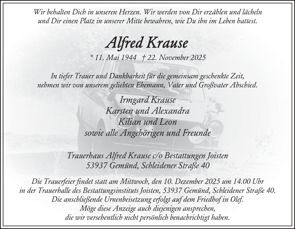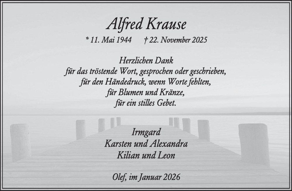 Hier finden Sie alle Traueranzeigen aus der Zeitung, die bisher für Alfred Krause erschienen sind. Weitere Traueranzeigen, die in der Zeitung erscheinen, werden hier ebenfalls aufgelistet