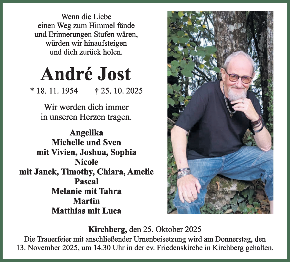 Hier finden Sie alle Traueranzeigen aus der Zeitung, die bisher für André Jost erschienen sind. Weitere Traueranzeigen, die in der Zeitung erscheinen, werden hier ebenfalls aufgelistet