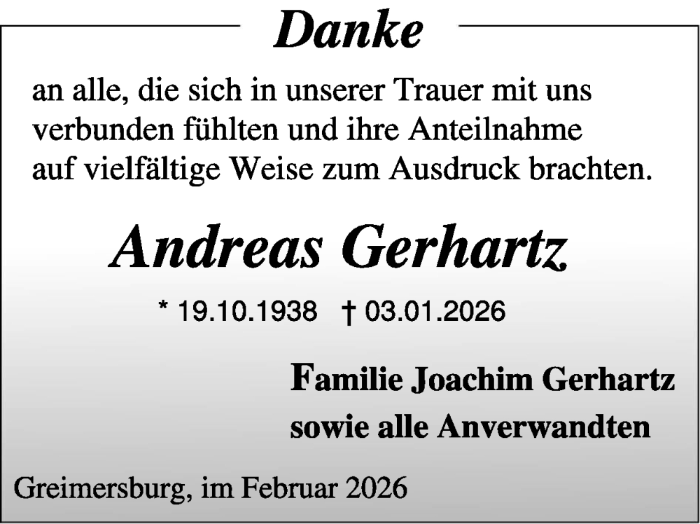 Hier finden Sie alle Traueranzeigen aus der Zeitung, die bisher für Andreas Gerhartz erschienen sind. Weitere Traueranzeigen, die in der Zeitung erscheinen, werden hier ebenfalls aufgelistet