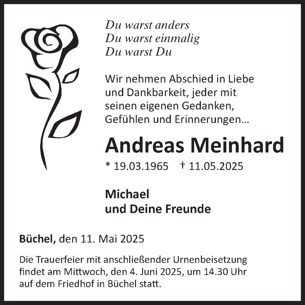 Hier finden Sie alle Traueranzeigen aus der Zeitung, die bisher für Andreas Meinhard erschienen sind. Weitere Traueranzeigen, die in der Zeitung erscheinen, werden hier ebenfalls aufgelistet