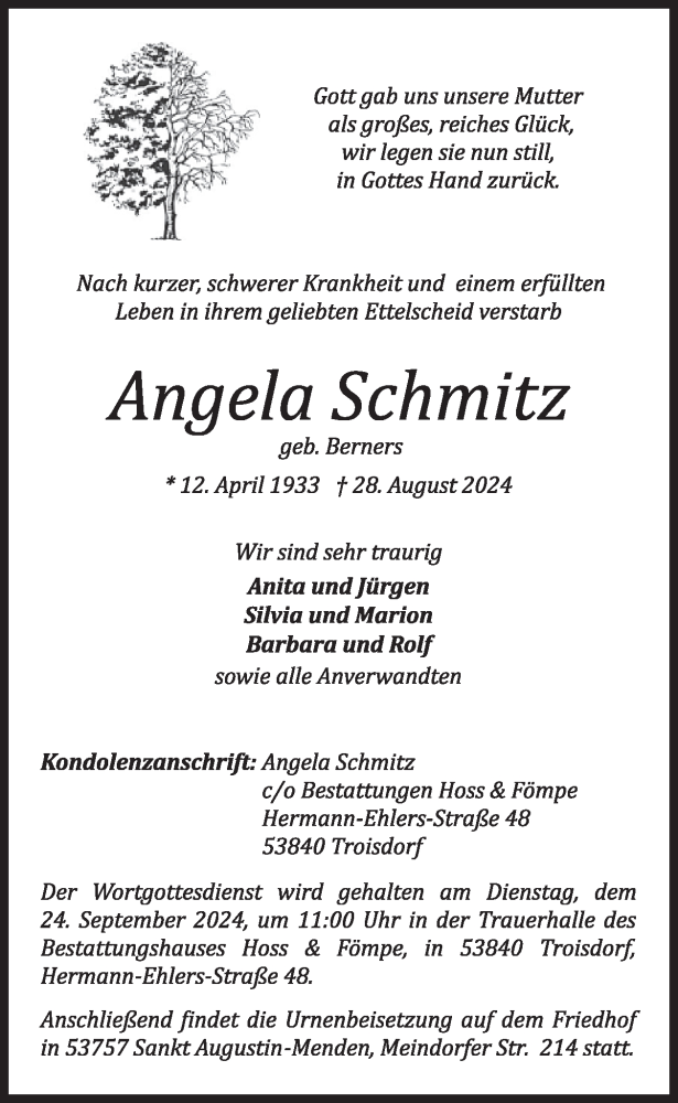 Hier finden Sie alle Traueranzeigen aus der Zeitung, die bisher für Angela Schmitz erschienen sind. Weitere Traueranzeigen, die in der Zeitung erscheinen, werden hier ebenfalls aufgelistet