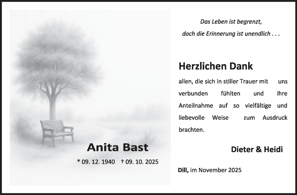 Hier finden Sie alle Traueranzeigen aus der Zeitung, die bisher für Anita Bast erschienen sind. Weitere Traueranzeigen, die in der Zeitung erscheinen, werden hier ebenfalls aufgelistet