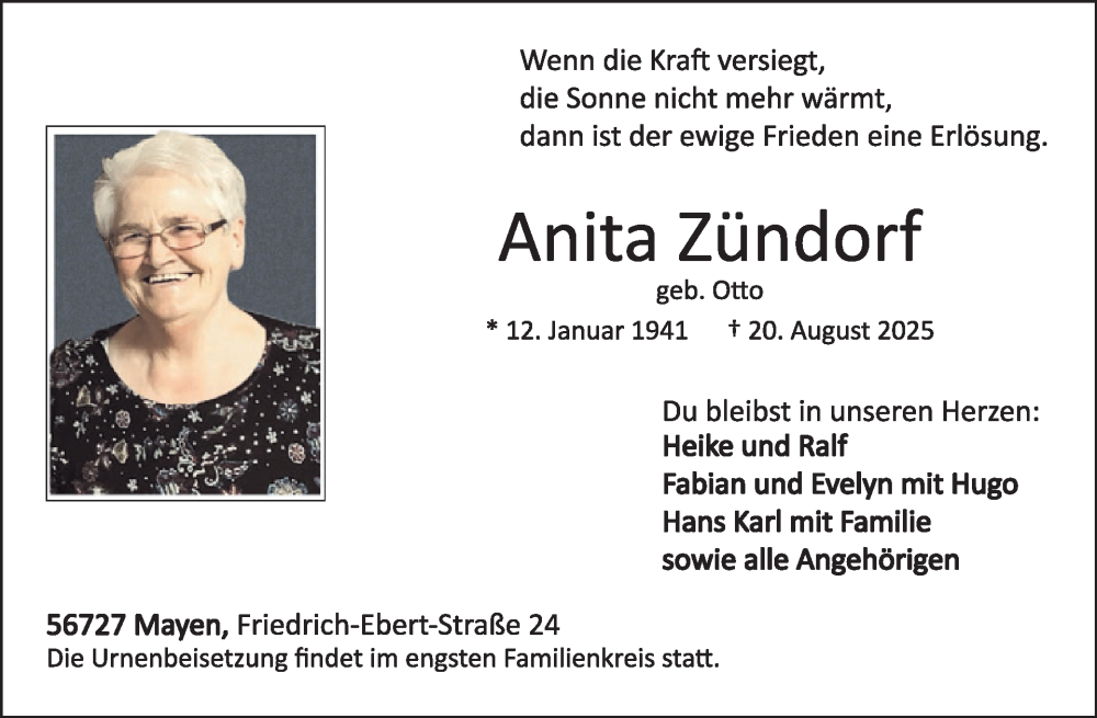 Hier finden Sie alle Traueranzeigen aus der Zeitung, die bisher für Anita Zündorf erschienen sind. Weitere Traueranzeigen, die in der Zeitung erscheinen, werden hier ebenfalls aufgelistet