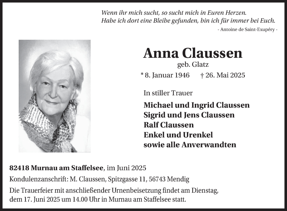Hier finden Sie alle Traueranzeigen aus der Zeitung, die bisher für Anna Claussen erschienen sind. Weitere Traueranzeigen, die in der Zeitung erscheinen, werden hier ebenfalls aufgelistet