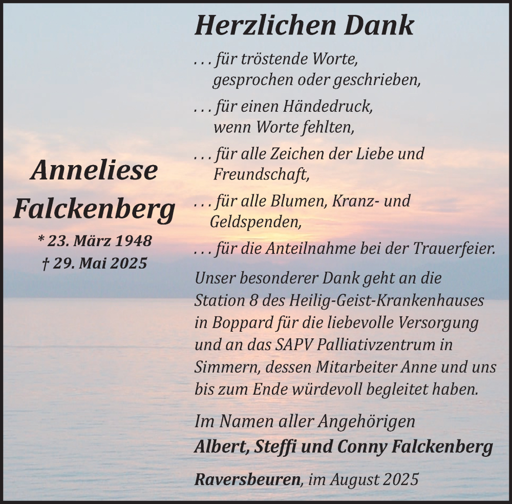 Hier finden Sie alle Traueranzeigen aus der Zeitung, die bisher für Anneliese Falckenberg erschienen sind. Weitere Traueranzeigen, die in der Zeitung erscheinen, werden hier ebenfalls aufgelistet