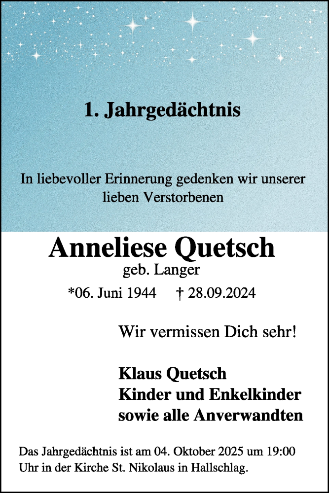 Hier finden Sie alle Traueranzeigen aus der Zeitung, die bisher für Anneliese Quetsch erschienen sind. Weitere Traueranzeigen, die in der Zeitung erscheinen, werden hier ebenfalls aufgelistet
