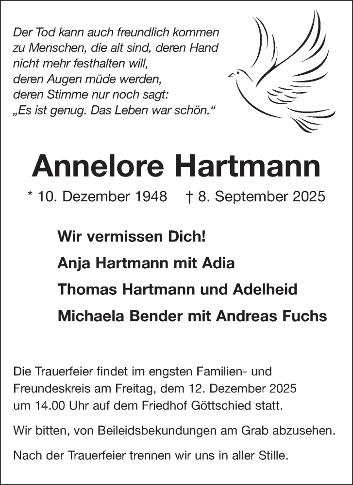 Hier finden Sie alle Traueranzeigen aus der Zeitung, die bisher für Annelore Hartmann erschienen sind. Weitere Traueranzeigen, die in der Zeitung erscheinen, werden hier ebenfalls aufgelistet
