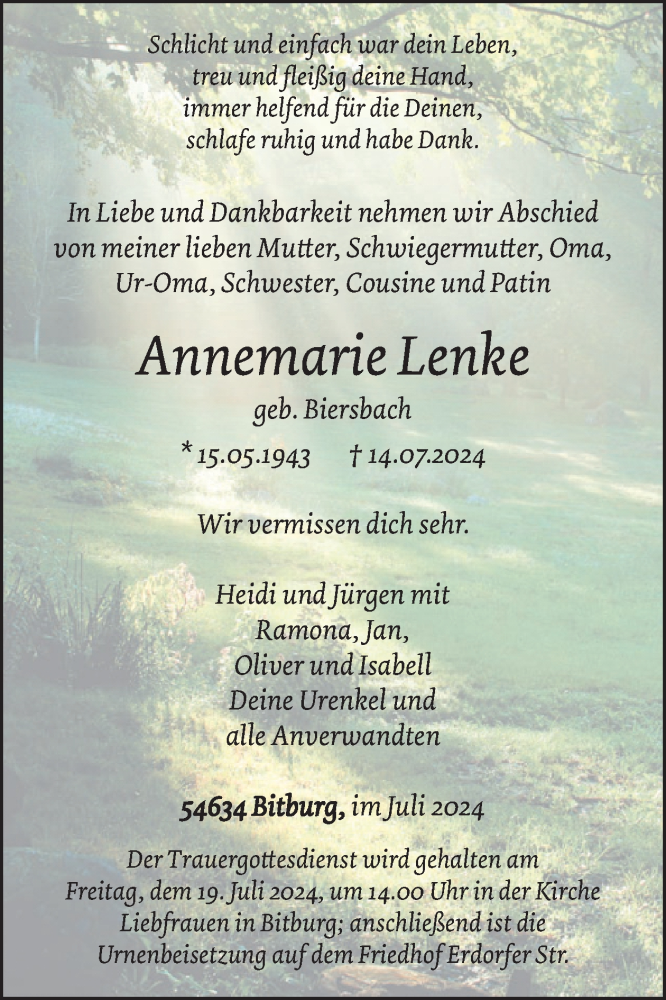 Hier finden Sie alle Traueranzeigen aus der Zeitung, die bisher für Annemarie Lenke erschienen sind. Weitere Traueranzeigen, die in der Zeitung erscheinen, werden hier ebenfalls aufgelistet