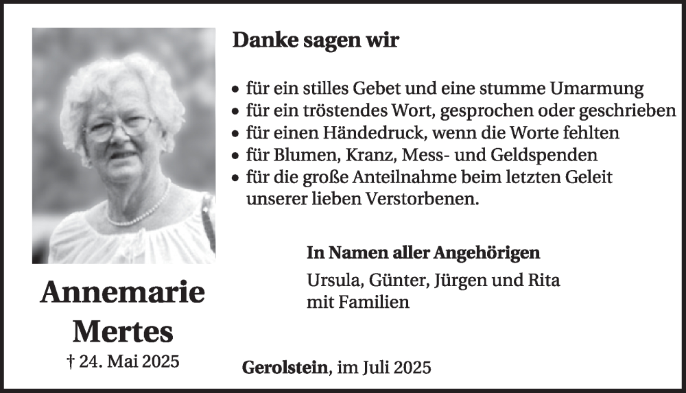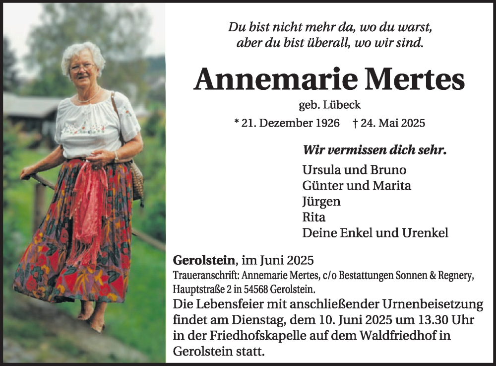 Hier finden Sie alle Traueranzeigen aus der Zeitung, die bisher für Annemarie Mertes erschienen sind. Weitere Traueranzeigen, die in der Zeitung erscheinen, werden hier ebenfalls aufgelistet