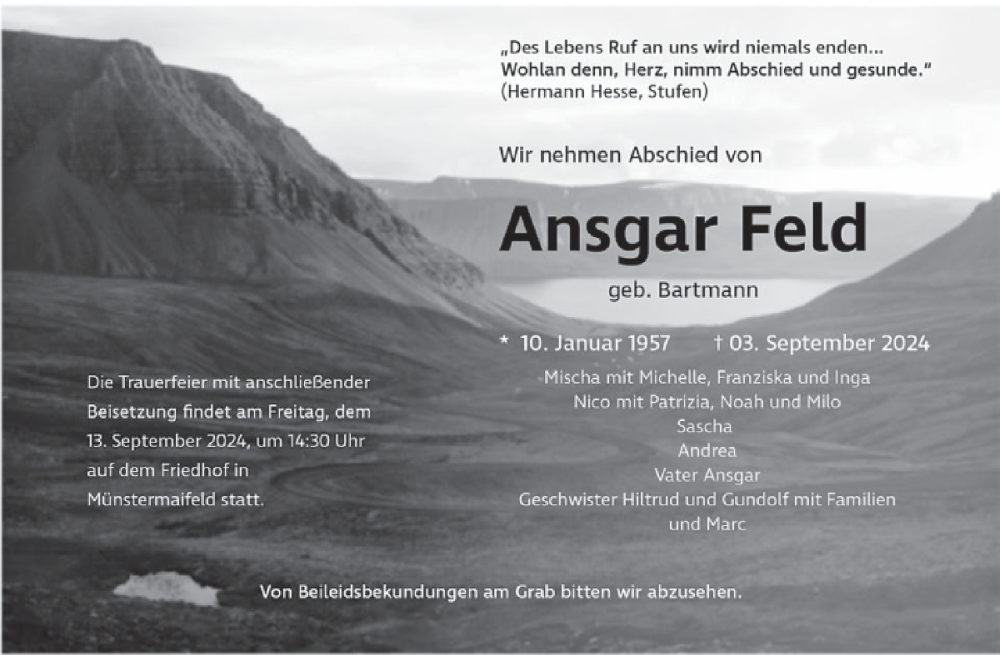 Hier finden Sie alle Traueranzeigen aus der Zeitung, die bisher für Ansgar Feld erschienen sind. Weitere Traueranzeigen, die in der Zeitung erscheinen, werden hier ebenfalls aufgelistet