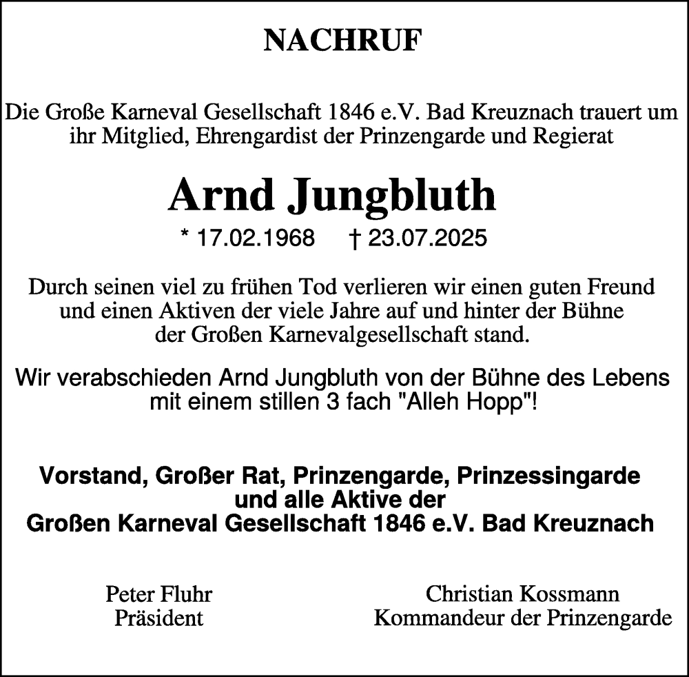 Hier finden Sie alle Traueranzeigen aus der Zeitung, die bisher für Arnd Jungbluth erschienen sind. Weitere Traueranzeigen, die in der Zeitung erscheinen, werden hier ebenfalls aufgelistet