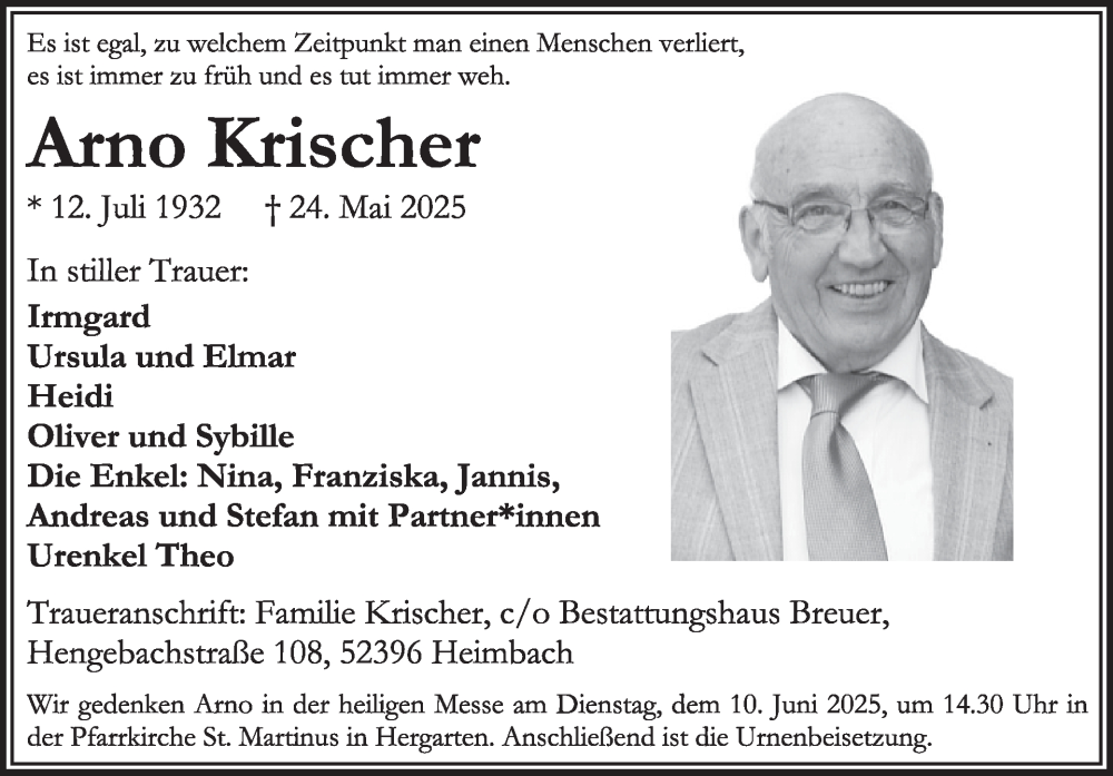 Hier finden Sie alle Traueranzeigen aus der Zeitung, die bisher für Arno Krischer erschienen sind. Weitere Traueranzeigen, die in der Zeitung erscheinen, werden hier ebenfalls aufgelistet