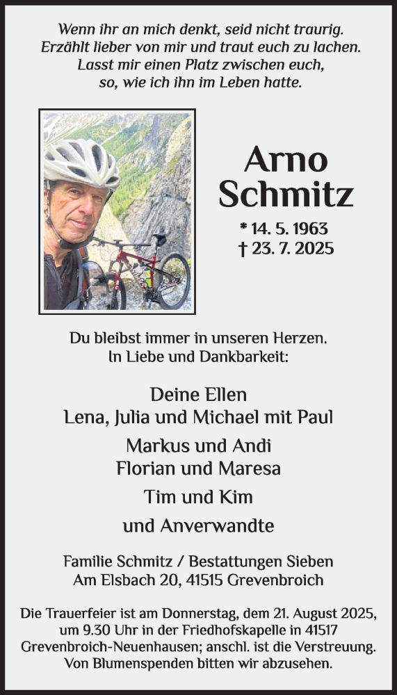 Hier finden Sie alle Traueranzeigen aus der Zeitung, die bisher für Arno Schmitz erschienen sind. Weitere Traueranzeigen, die in der Zeitung erscheinen, werden hier ebenfalls aufgelistet