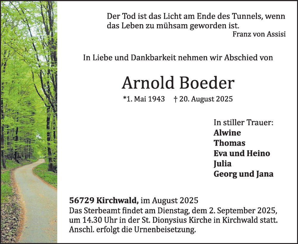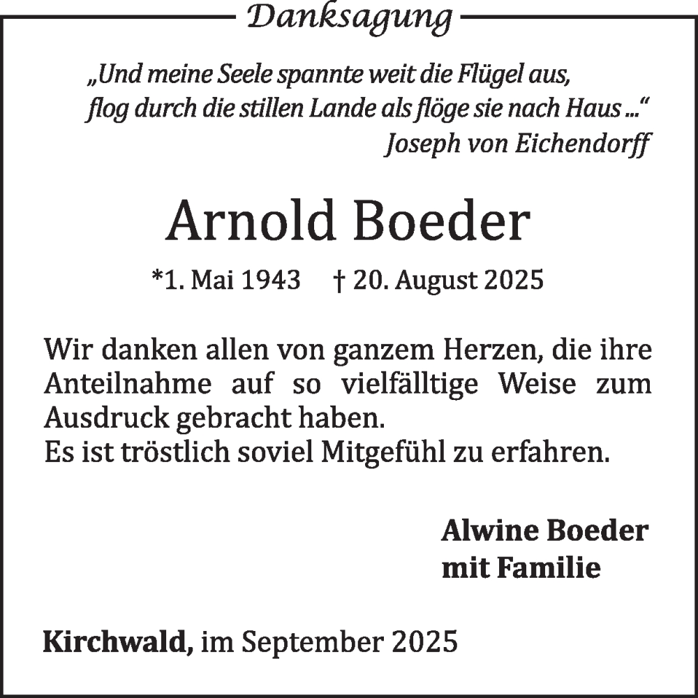 Hier finden Sie alle Traueranzeigen aus der Zeitung, die bisher für Arnold Boeder erschienen sind. Weitere Traueranzeigen, die in der Zeitung erscheinen, werden hier ebenfalls aufgelistet