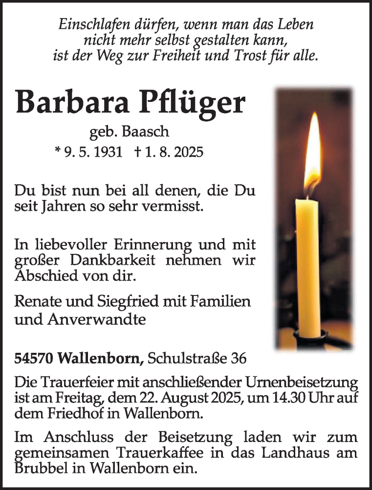 Hier finden Sie alle Traueranzeigen aus der Zeitung, die bisher für Barbara Pflüger erschienen sind. Weitere Traueranzeigen, die in der Zeitung erscheinen, werden hier ebenfalls aufgelistet