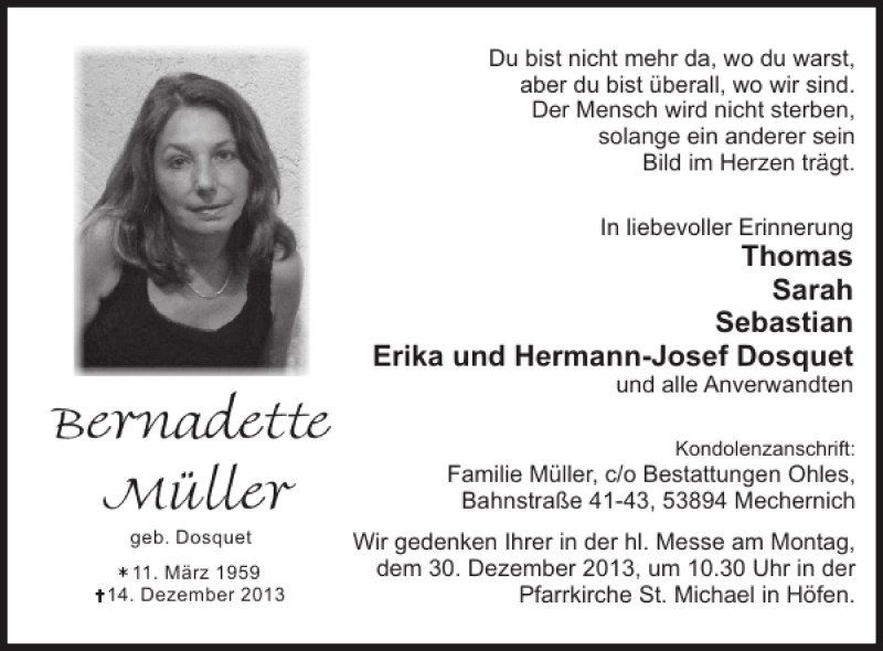 Hier finden Sie alle Traueranzeigen aus der Zeitung, die bisher für Bernadette Müller erschienen sind. Weitere Traueranzeigen, die in der Zeitung erscheinen, werden hier ebenfalls aufgelistet