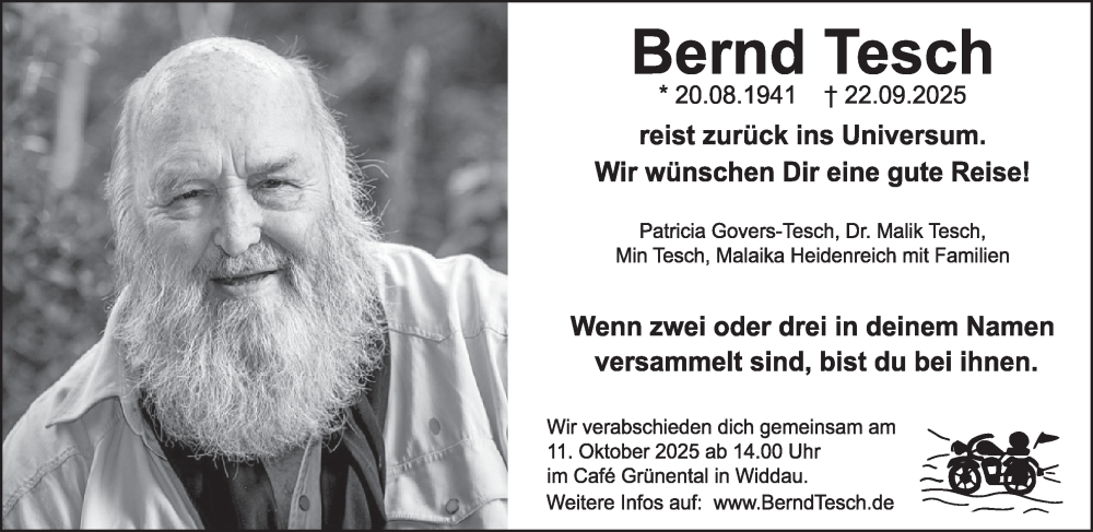 Hier finden Sie alle Traueranzeigen aus der Zeitung, die bisher für Bernd Tesch erschienen sind. Weitere Traueranzeigen, die in der Zeitung erscheinen, werden hier ebenfalls aufgelistet