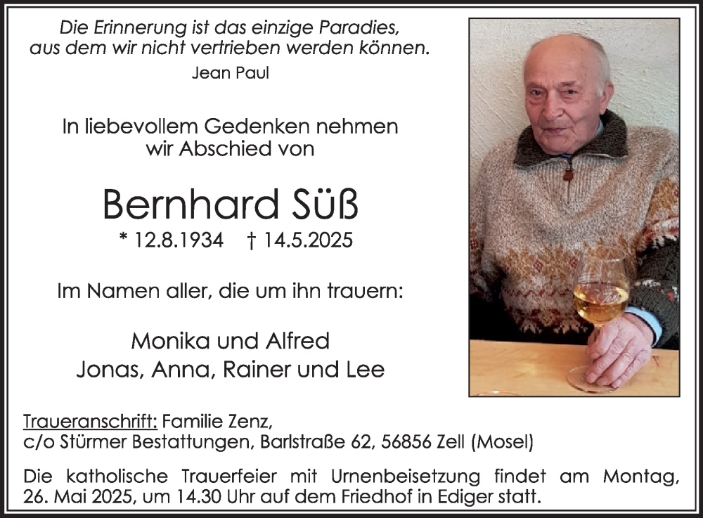 Hier finden Sie alle Traueranzeigen aus der Zeitung, die bisher für Bernhard Süß erschienen sind. Weitere Traueranzeigen, die in der Zeitung erscheinen, werden hier ebenfalls aufgelistet