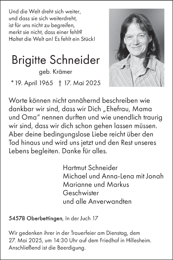 Hier finden Sie alle Traueranzeigen aus der Zeitung, die bisher für Brigitte Schneider erschienen sind. Weitere Traueranzeigen, die in der Zeitung erscheinen, werden hier ebenfalls aufgelistet