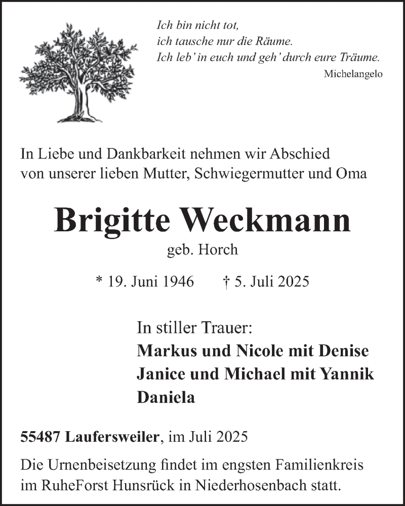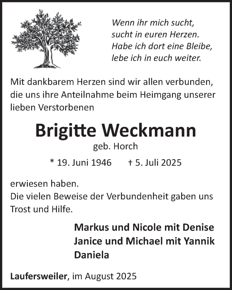 Hier finden Sie alle Traueranzeigen aus der Zeitung, die bisher für Brigitte Weckmann erschienen sind. Weitere Traueranzeigen, die in der Zeitung erscheinen, werden hier ebenfalls aufgelistet