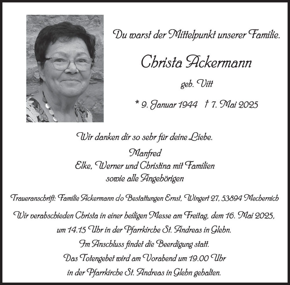 Hier finden Sie alle Traueranzeigen aus der Zeitung, die bisher für Christa Ackermann erschienen sind. Weitere Traueranzeigen, die in der Zeitung erscheinen, werden hier ebenfalls aufgelistet
