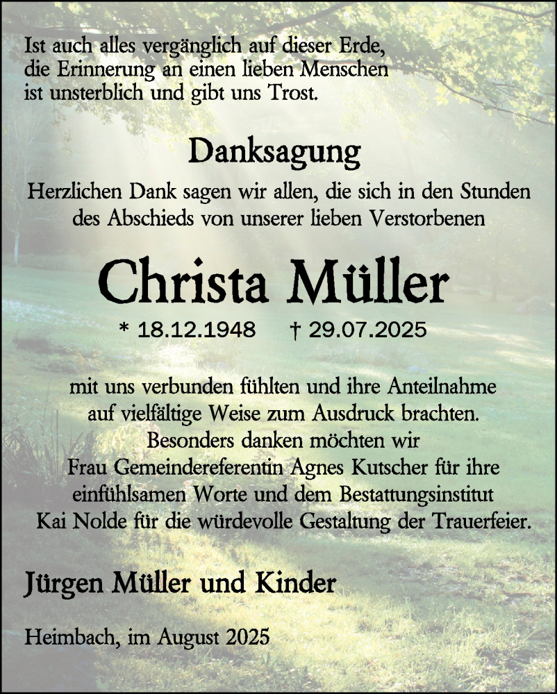 Hier finden Sie alle Traueranzeigen aus der Zeitung, die bisher für Christa Müller erschienen sind. Weitere Traueranzeigen, die in der Zeitung erscheinen, werden hier ebenfalls aufgelistet