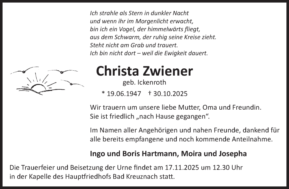 Hier finden Sie alle Traueranzeigen aus der Zeitung, die bisher für Christa Zwiener erschienen sind. Weitere Traueranzeigen, die in der Zeitung erscheinen, werden hier ebenfalls aufgelistet