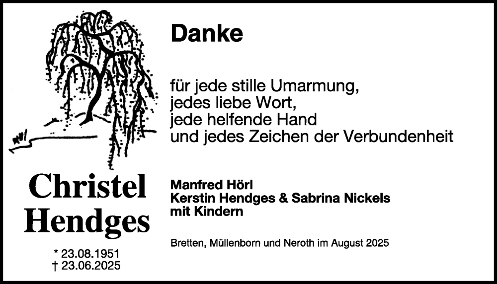 Hier finden Sie alle Traueranzeigen aus der Zeitung, die bisher für Christel Hendges erschienen sind. Weitere Traueranzeigen, die in der Zeitung erscheinen, werden hier ebenfalls aufgelistet