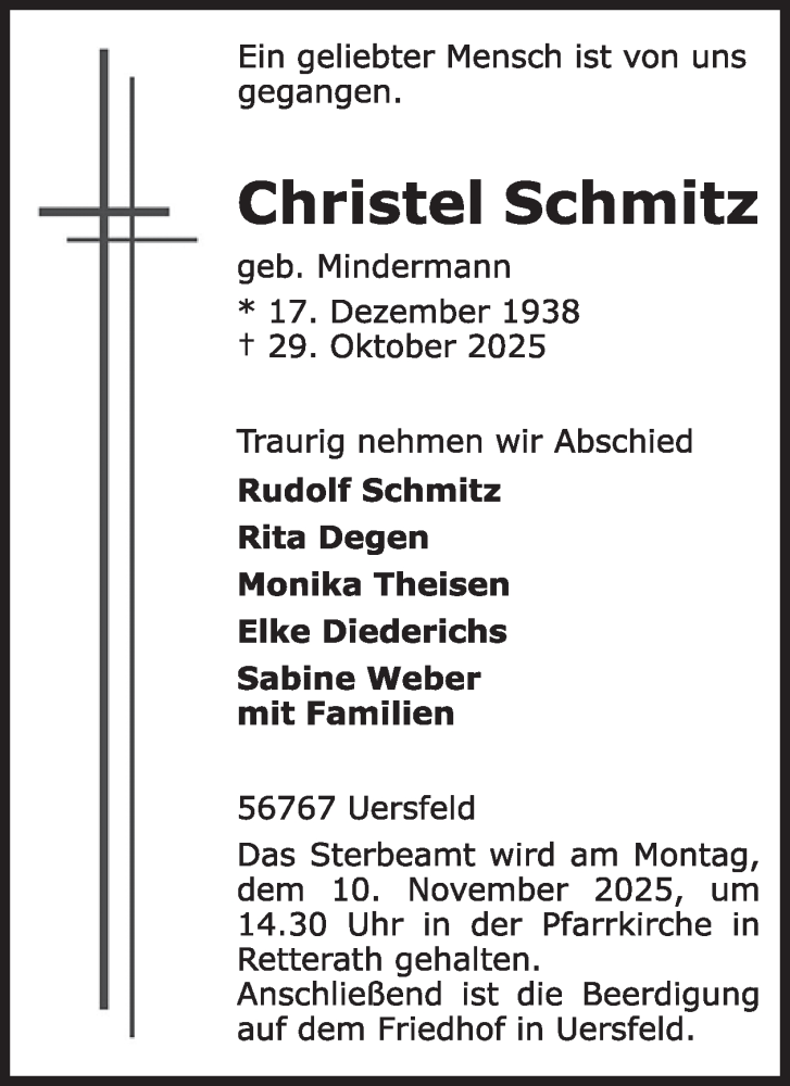 Hier finden Sie alle Traueranzeigen aus der Zeitung, die bisher für Christel Schmitz erschienen sind. Weitere Traueranzeigen, die in der Zeitung erscheinen, werden hier ebenfalls aufgelistet