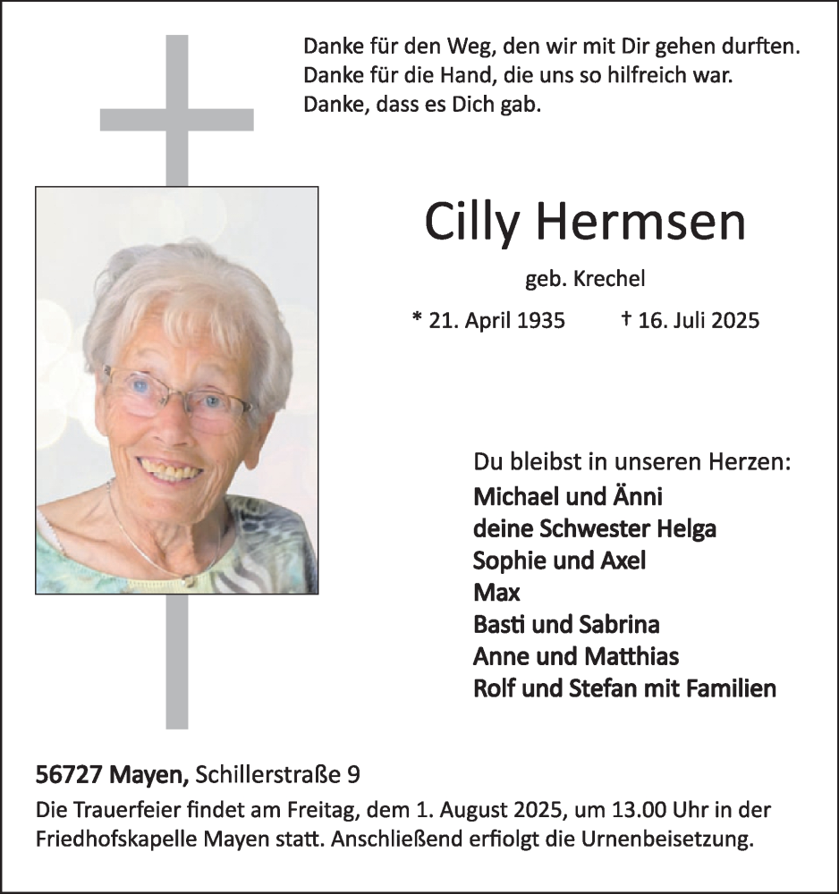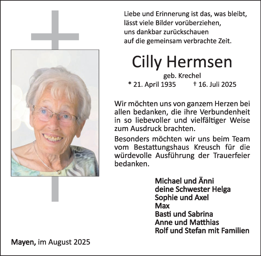 Hier finden Sie alle Traueranzeigen aus der Zeitung, die bisher für Cilly Hermsen erschienen sind. Weitere Traueranzeigen, die in der Zeitung erscheinen, werden hier ebenfalls aufgelistet