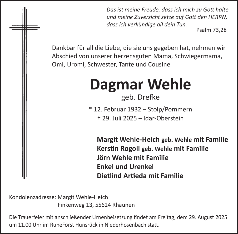 Hier finden Sie alle Traueranzeigen aus der Zeitung, die bisher für Dagmar Wehle erschienen sind. Weitere Traueranzeigen, die in der Zeitung erscheinen, werden hier ebenfalls aufgelistet