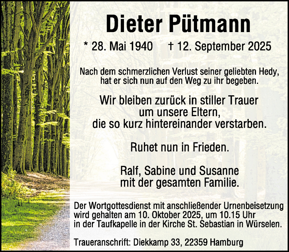 Hier finden Sie alle Traueranzeigen aus der Zeitung, die bisher für Dieter Pütmann erschienen sind. Weitere Traueranzeigen, die in der Zeitung erscheinen, werden hier ebenfalls aufgelistet