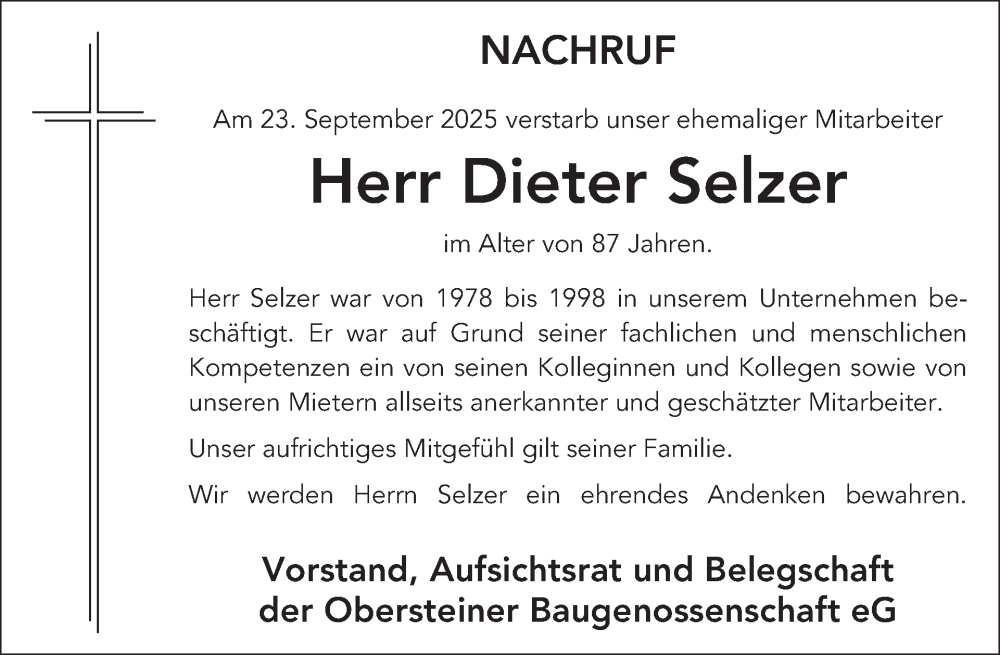 Hier finden Sie alle Traueranzeigen aus der Zeitung, die bisher für Dieter Selzer erschienen sind. Weitere Traueranzeigen, die in der Zeitung erscheinen, werden hier ebenfalls aufgelistet