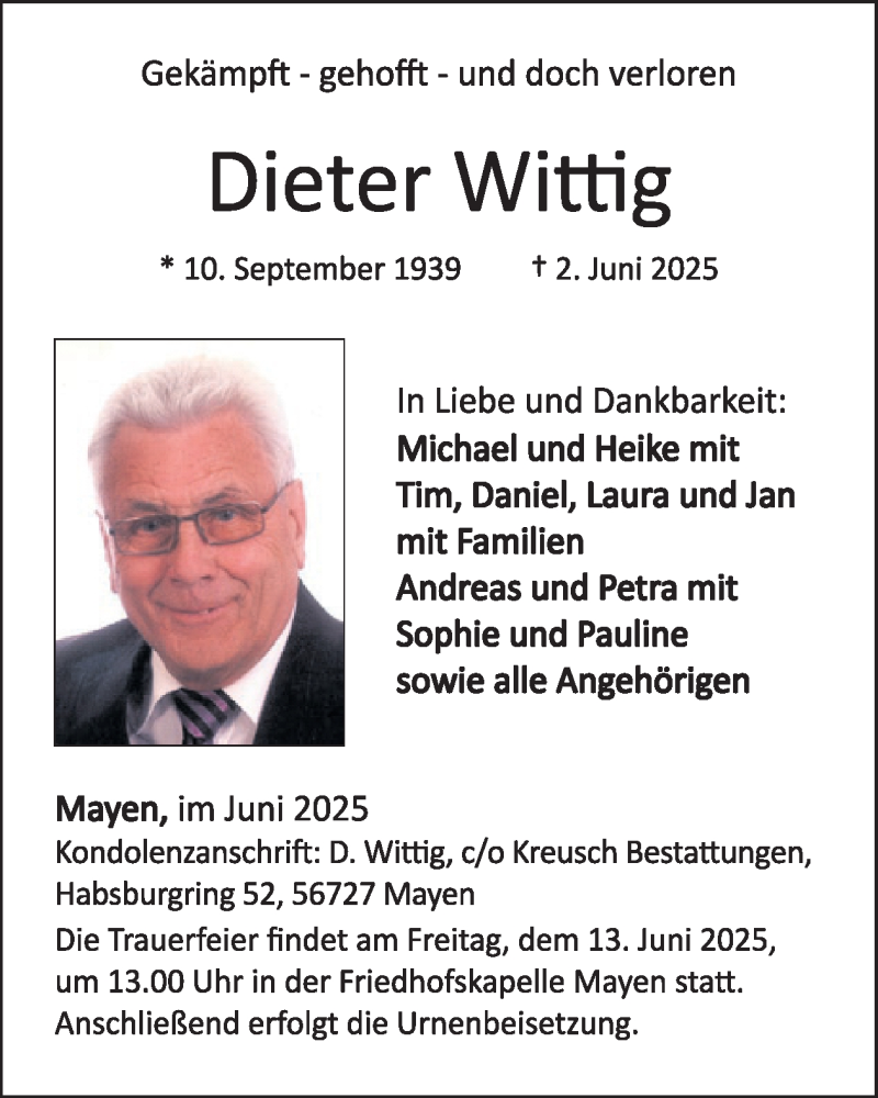 Hier finden Sie alle Traueranzeigen aus der Zeitung, die bisher für Dieter Wittig erschienen sind. Weitere Traueranzeigen, die in der Zeitung erscheinen, werden hier ebenfalls aufgelistet
