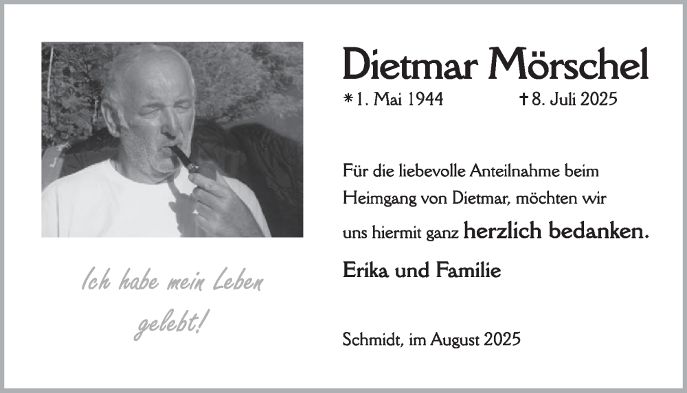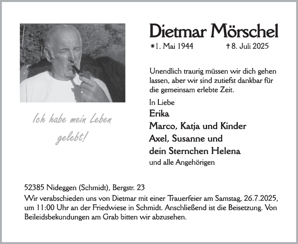 Hier finden Sie alle Traueranzeigen aus der Zeitung, die bisher für Dietmar Mörschel erschienen sind. Weitere Traueranzeigen, die in der Zeitung erscheinen, werden hier ebenfalls aufgelistet