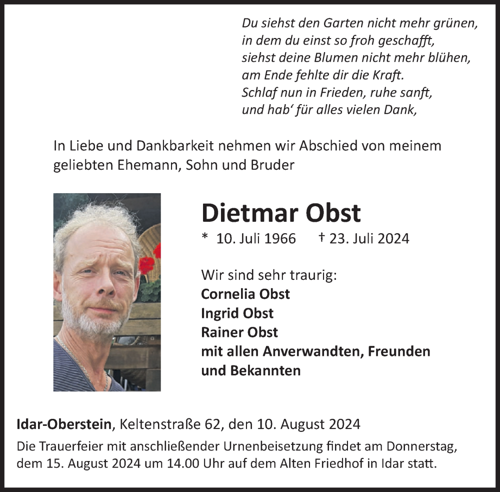 Hier finden Sie alle Traueranzeigen aus der Zeitung, die bisher für Dietmar Obst erschienen sind. Weitere Traueranzeigen, die in der Zeitung erscheinen, werden hier ebenfalls aufgelistet