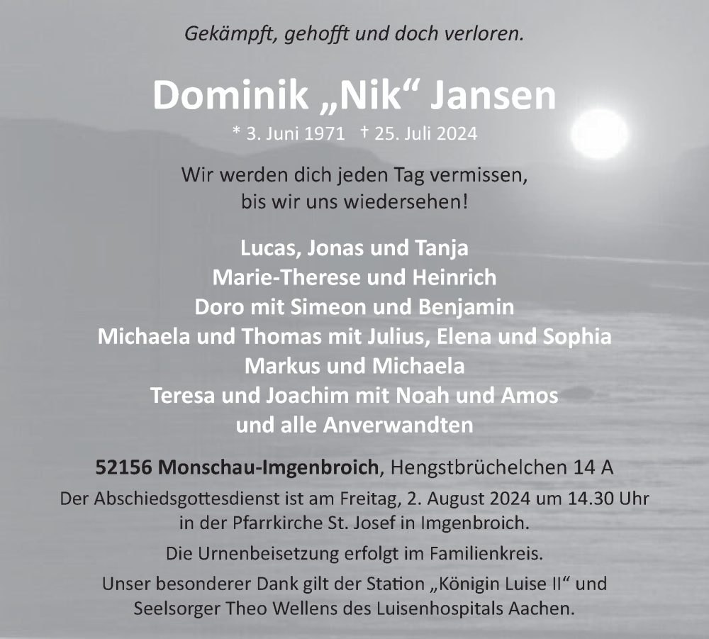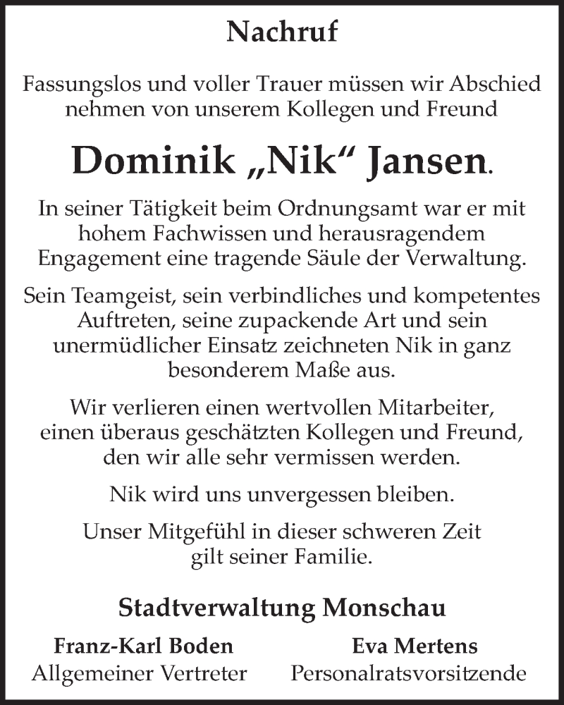 Hier finden Sie alle Traueranzeigen aus der Zeitung, die bisher für Dominik Jansen erschienen sind. Weitere Traueranzeigen, die in der Zeitung erscheinen, werden hier ebenfalls aufgelistet