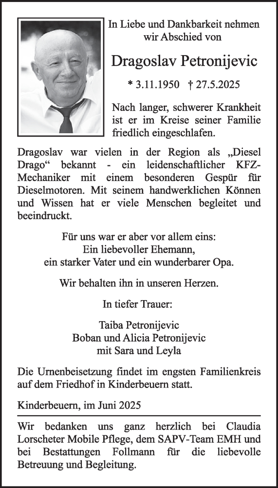 Hier finden Sie alle Traueranzeigen aus der Zeitung, die bisher für Dragoslav Petronijevic erschienen sind. Weitere Traueranzeigen, die in der Zeitung erscheinen, werden hier ebenfalls aufgelistet
