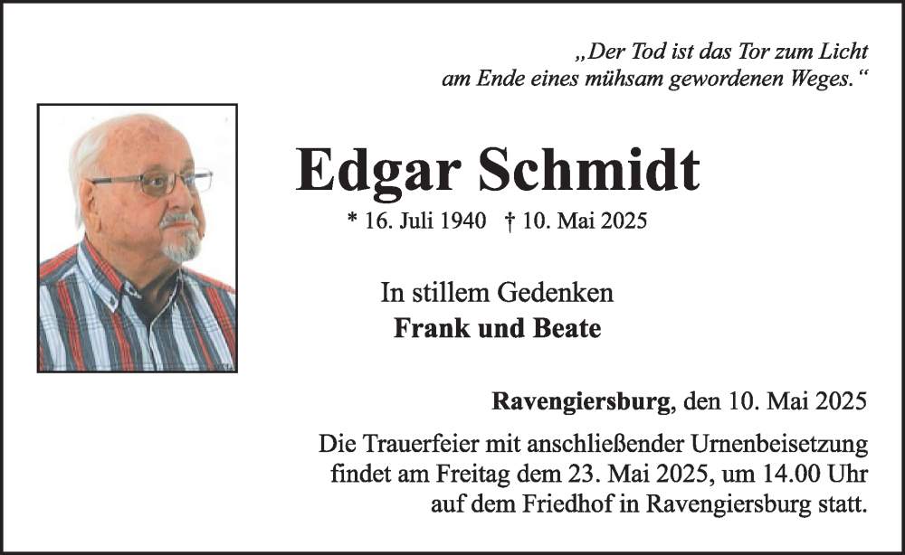 Hier finden Sie alle Traueranzeigen aus der Zeitung, die bisher für Edgar Schmidt erschienen sind. Weitere Traueranzeigen, die in der Zeitung erscheinen, werden hier ebenfalls aufgelistet